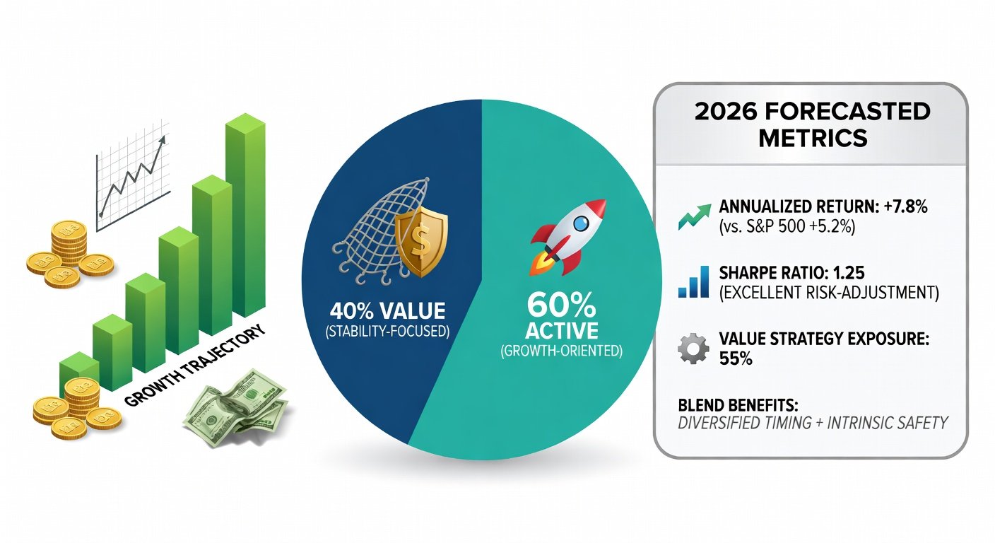 - Hybrid (Balanced): 50% Value Core (VTV), 30% Active Sector ETF (XLE), 20% Opportunistic Picks. Projected: 11-13% return, 22% drawdown.