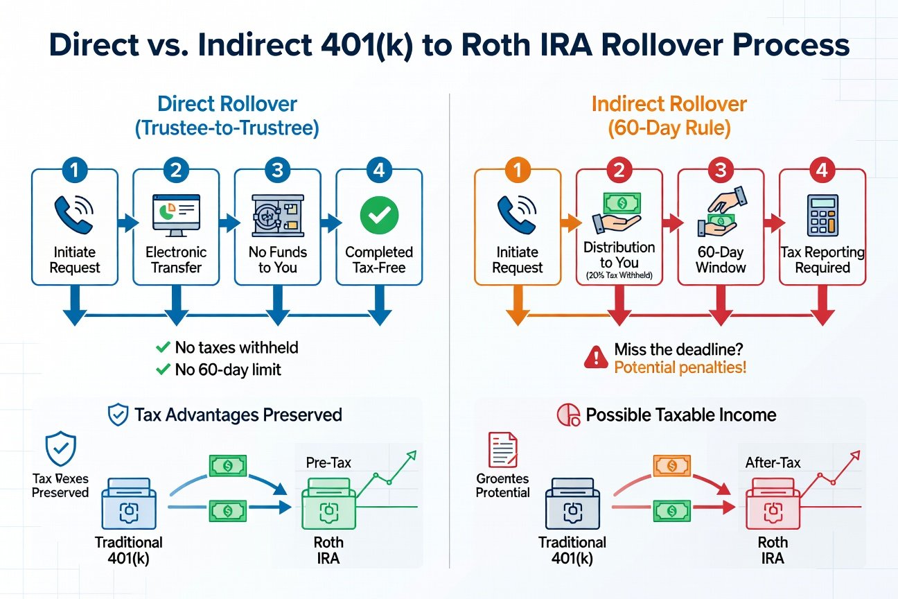 Your 401k provider transfers funds straight to your Roth IRA custodian. No taxes withheld, no 60-day rule stress. Ideal for simplicity and avoiding penalties.